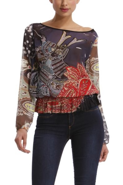 Deze korte damesbloes gemaakt van een half doorschijnende chiffon, heeft een mooie geplooide onderkant.